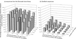 In case of nifH and nosZ all sequences published in GenBank (Jan 2004 and Feb 2005, respectively) were tested for TReFID. Only sequences containing the binding site for the fluorochrome-labelled PCR primers used in tRFLP analyses were included in the databases. These were the primers nifH-F (aaa ggY ggW atc ggY aaR tcc acc ac), binding near the 5' end of nifH, and nosZ-R (tcc atg tgc agN gcR tgg cag aa), binding close to the 3' terminus of nosZ. Because the nifH and nosZ genes have no motifs comparably highly conserved as some regions in the SSU gene, and because of the limited sequence information, primers targetting these genes are "less universal" than established SSU primers like 8F, 27F, or 63F. As a consequence, the primers nifH-F and nosZ-R allow to exploit only about half the available sequence information for the respective gene. However, this proportion would not have been larger using alternative primers. Concerning the SSU gene, about 40,000 out of 150,000 GenBank sequences published in Feb 2005 were tested. Of these, about 21,000 sequences contained in the TReFID SSU database (version B) included the binding site for 63F, the primer used for tRFLP. Database overview