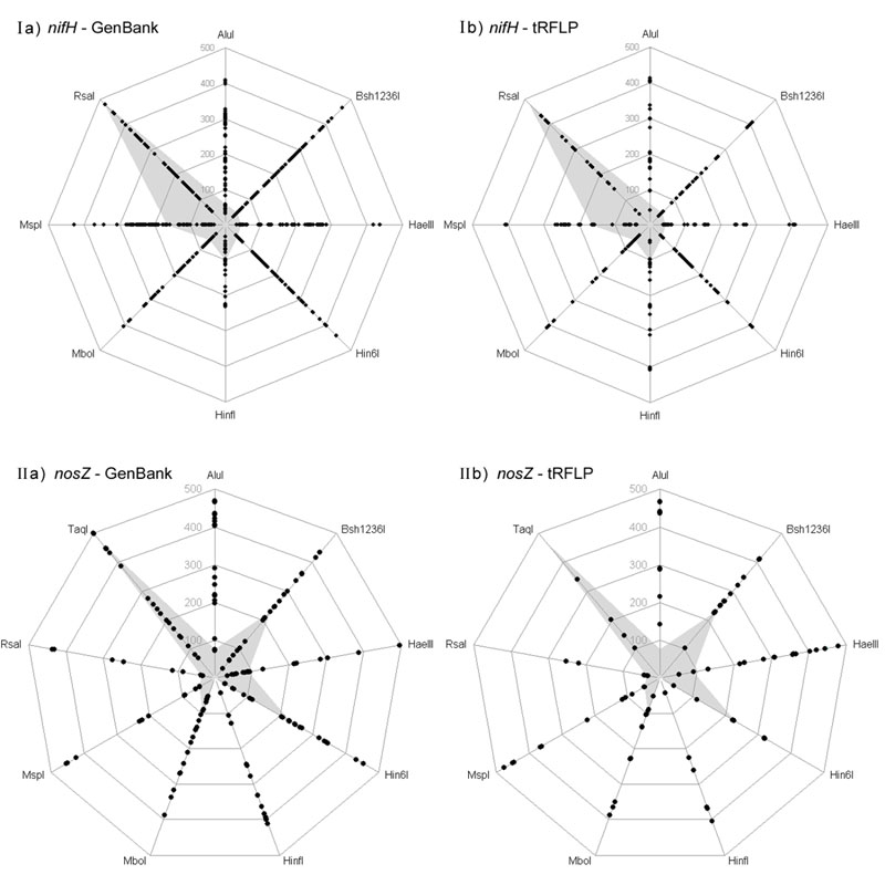 Graphical representation of the tRFs obtained for nifH of N2-fixing and nosZ of denitrifying microorganisms.