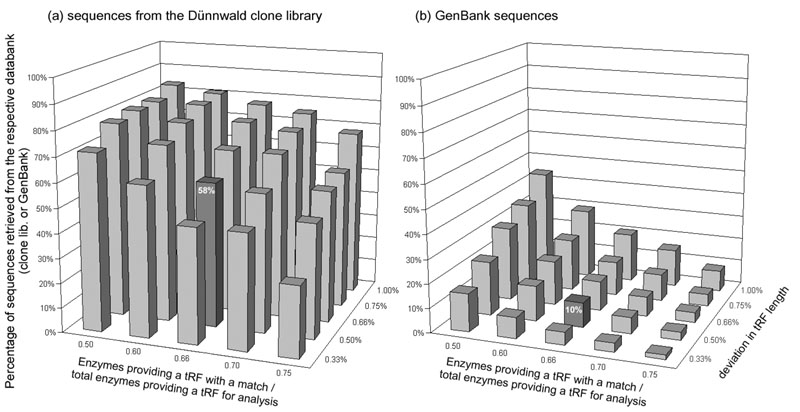 DNA was isolated from the Dünnwald soil and the length of the tRFs obtained with all 13 restriction enzymes was experimentally determined for the 16S rRNA gene. The lengths of the tRFs were then compared with those calculated from the sequences a) of the Dünnwald clone library, b) of GenBank. The ordinate represents the percentage of polygons of the soil DNA among the total polygons of either the Dünnwald clone library (a) or the GenBank sequences (b). One abscissa (front side) denotes the proportion of enzymes providing a tRF with a match referred to the total number of enzymes employed and providing tRFs for analysis. The other abscissa (right side) denotes the deviation in the length of the tRFs. The percentage of sequences retrieved was low when the deviation was restricted to be ≤ 0.33 % and high at a deviation of ≤ 1.00 %. For the further calculations, the values 0.66 (for the number of matches) and 0.5 % (for the deviation) were selected (dark column in both parts of the figure). However, score values of either 1.0, 0.5 or 0.25 (for definitions see text) were taken for the calculations and this figure.